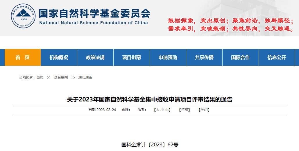 关于2023年国家自然科学基金集中接收申请项目评审结果的通告